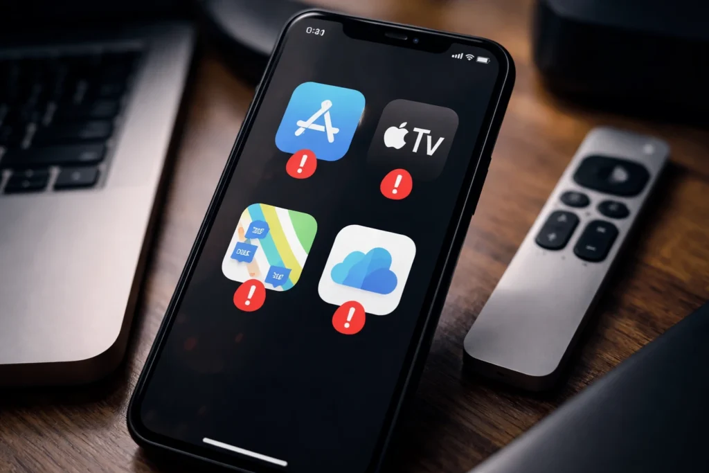 Outages appear to be caused by central server or cloud infrastructure issues affecting multiple Apple services.